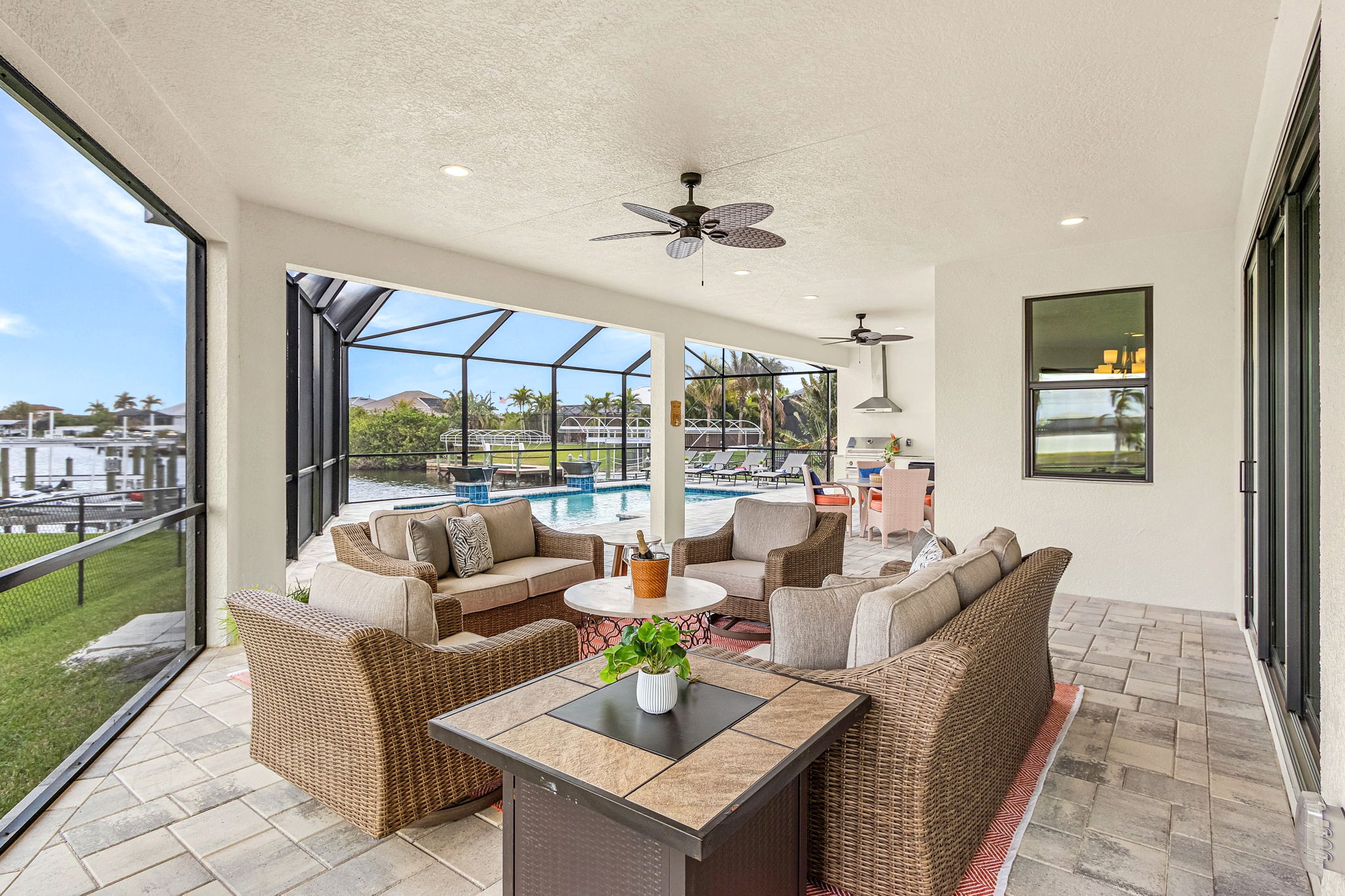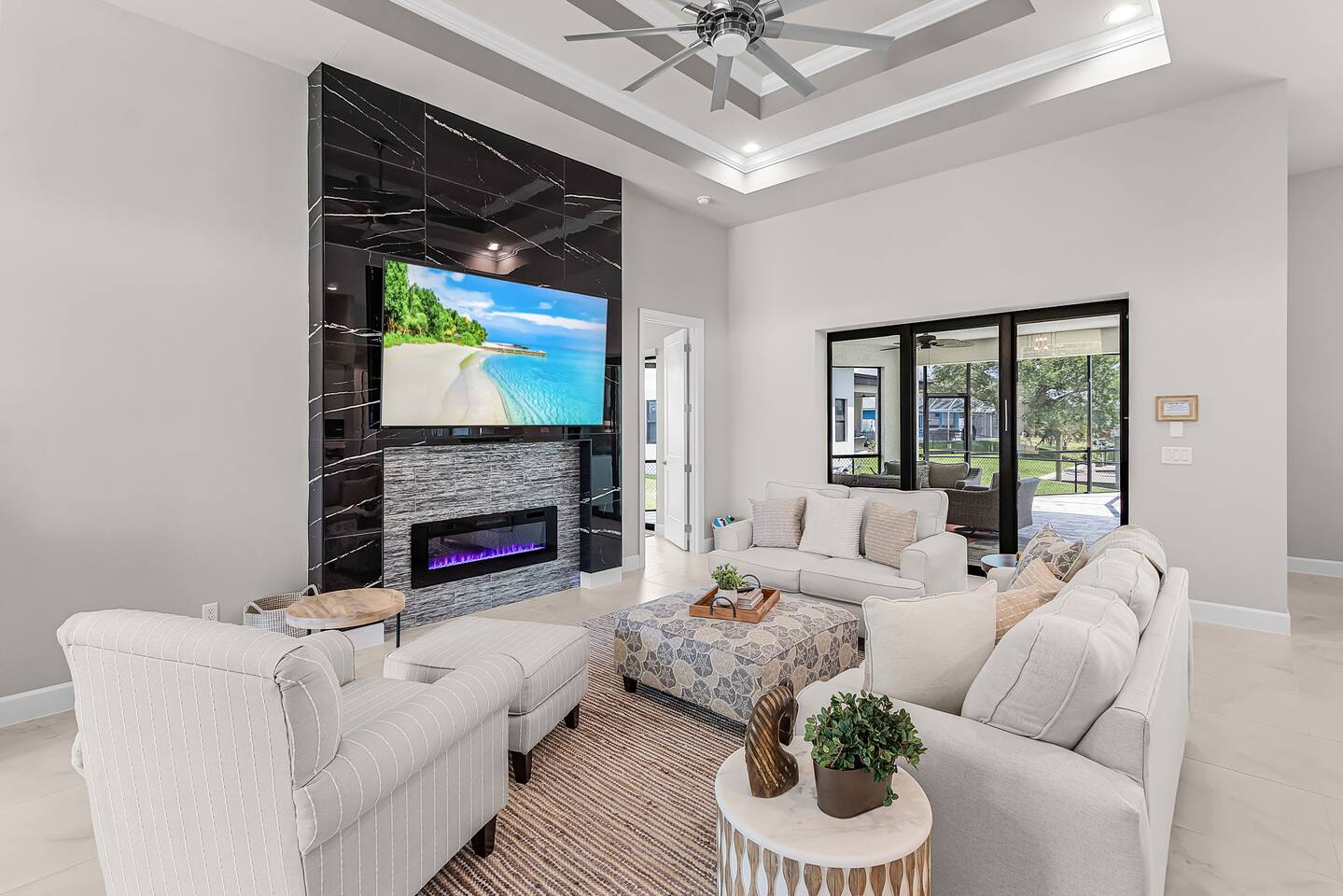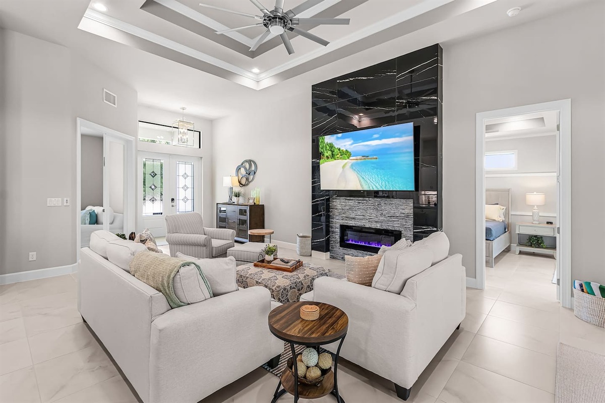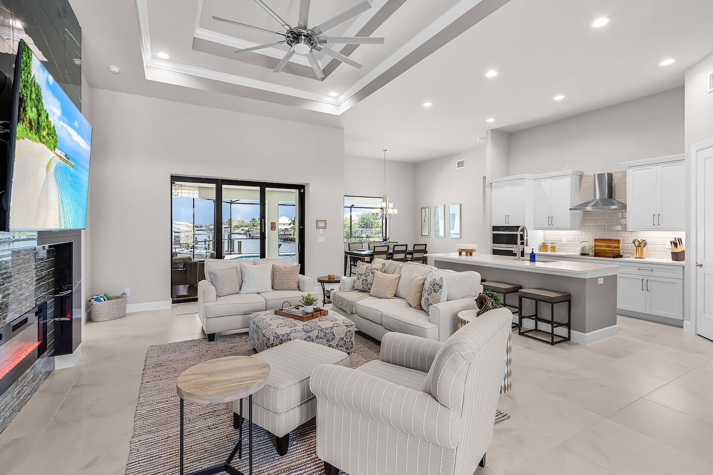 Upon entering, you’re immediately welcomed into a bright, open-concept living area filled with natural light and serene water views. Designed with both elegance and comfort in mind, the living space features plush seating and a modern fireplace, creating the perfect setting for cozy movie nights or relaxed evenings after a day on the water. The kitchen is a true chef’s dream, showcasing brand-new modern appliances, quartz countertops, and a spacious island with seating for four - ideal for preparing and enjoying fresh, tropical-inspired meals. The dining area seats six and overlooks the pool and canal, offering a beautiful backdrop that elevates every meal.