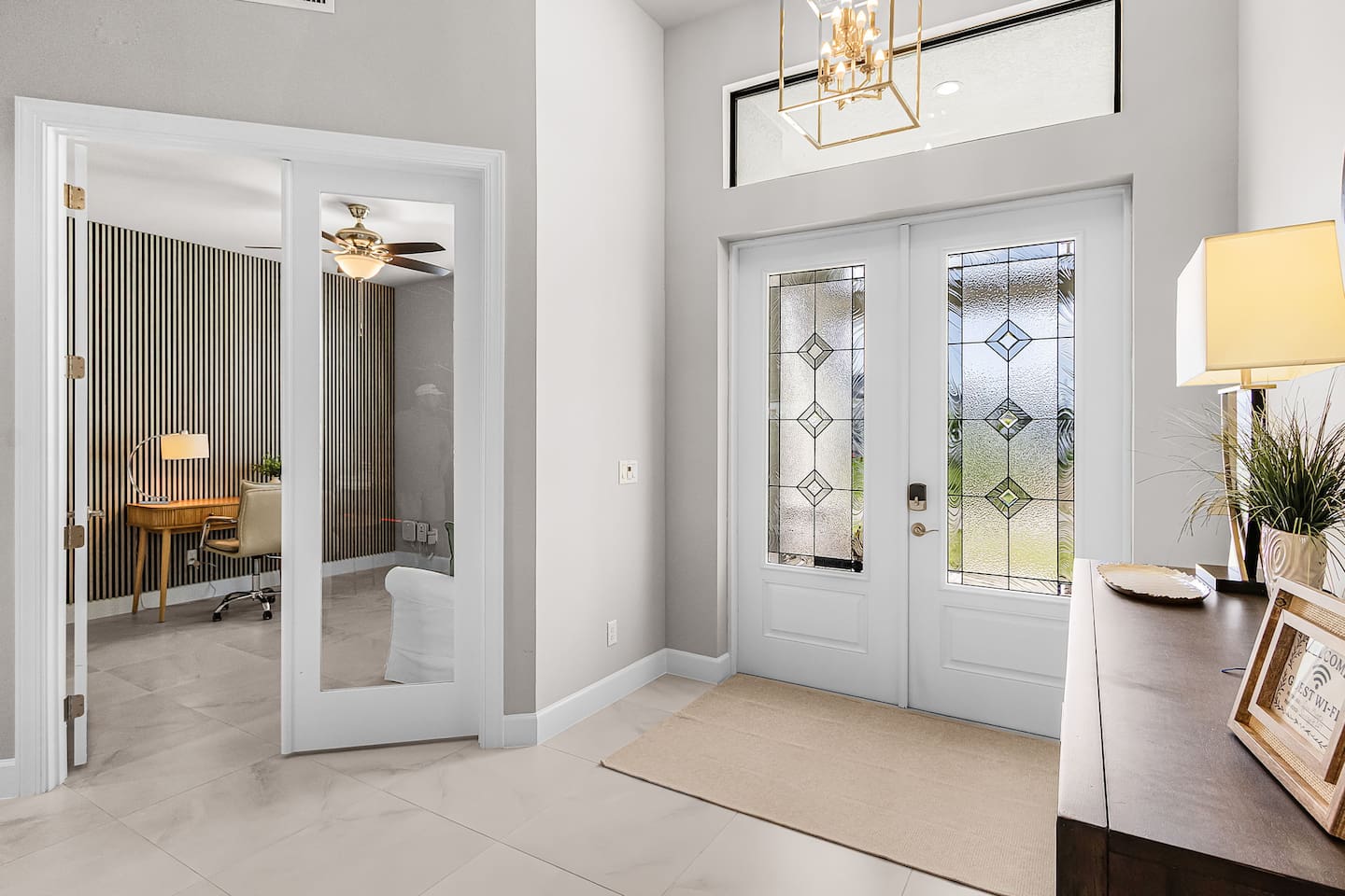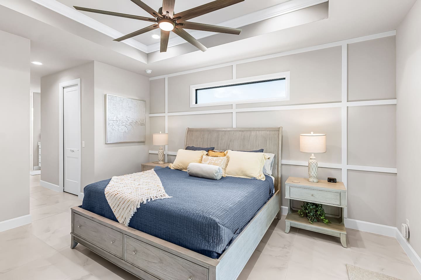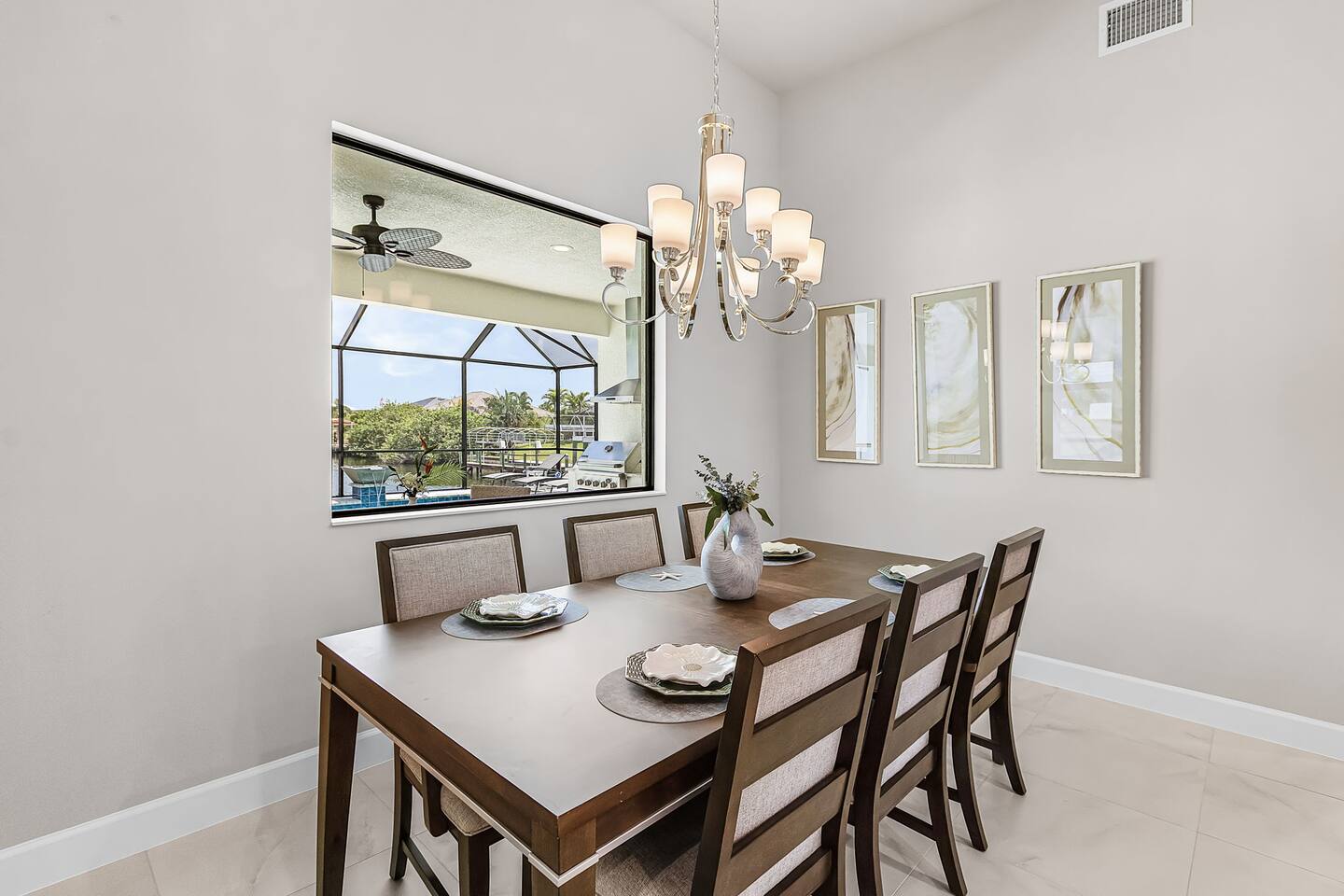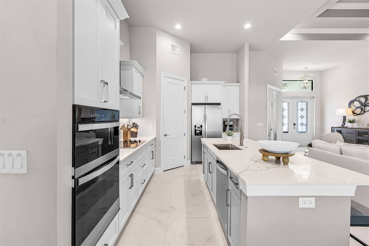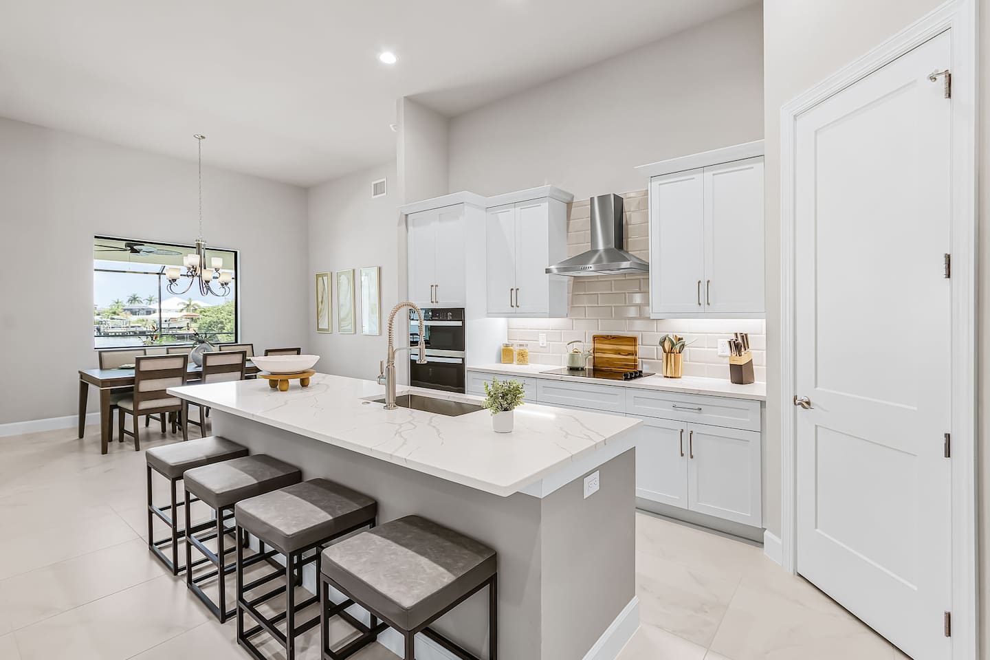 Upon entering, you’re immediately welcomed into a bright, open-concept living area filled with natural light and serene water views. Designed with both elegance and comfort in mind, the living space features plush seating and a modern fireplace, creating the perfect setting for cozy movie nights or relaxed evenings after a day on the water. The kitchen is a true chef’s dream, showcasing brand-new modern appliances, quartz countertops, and a spacious island with seating for four - ideal for preparing and enjoying fresh, tropical-inspired meals. The dining area seats six and overlooks the pool and canal, offering a beautiful backdrop that elevates every meal.