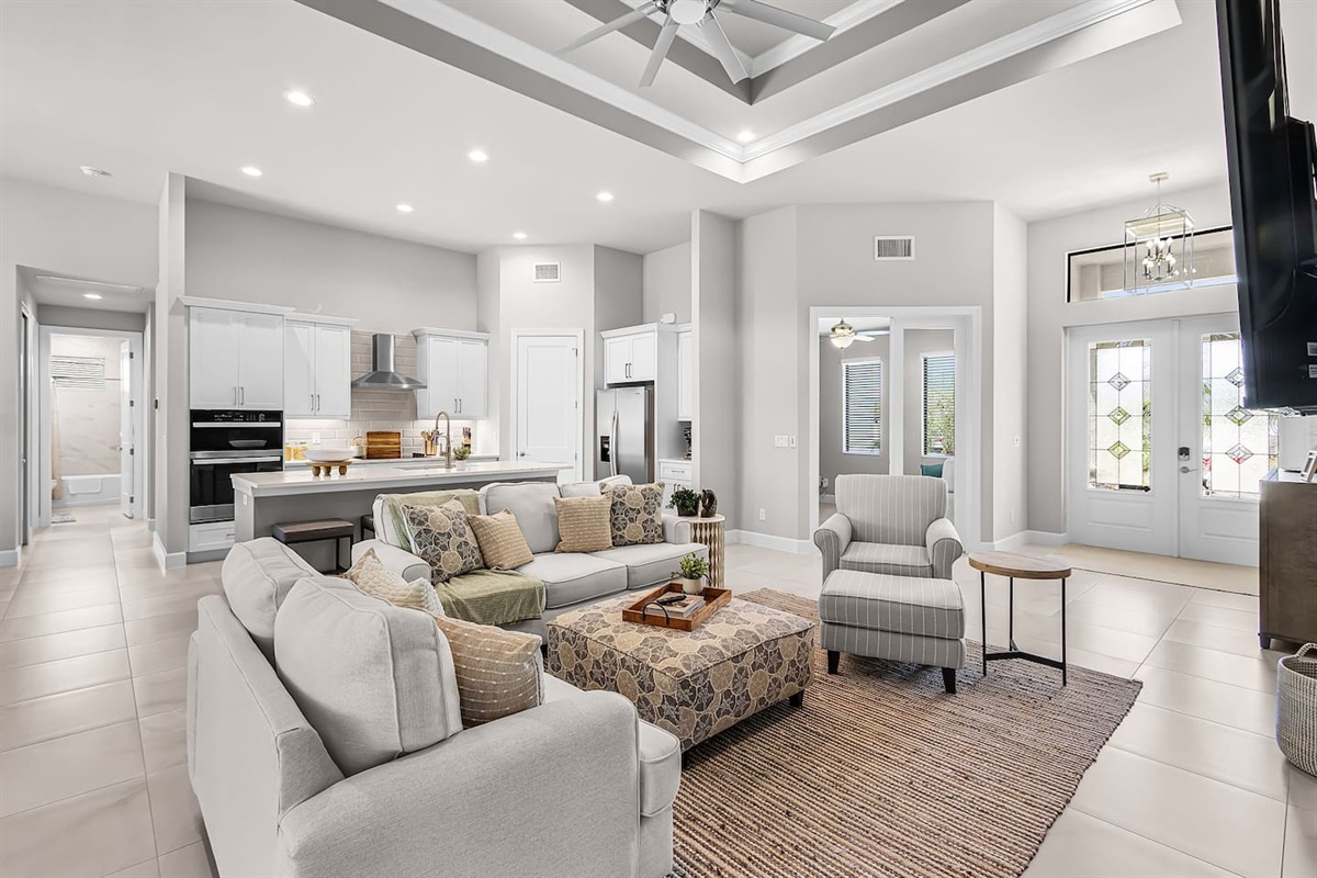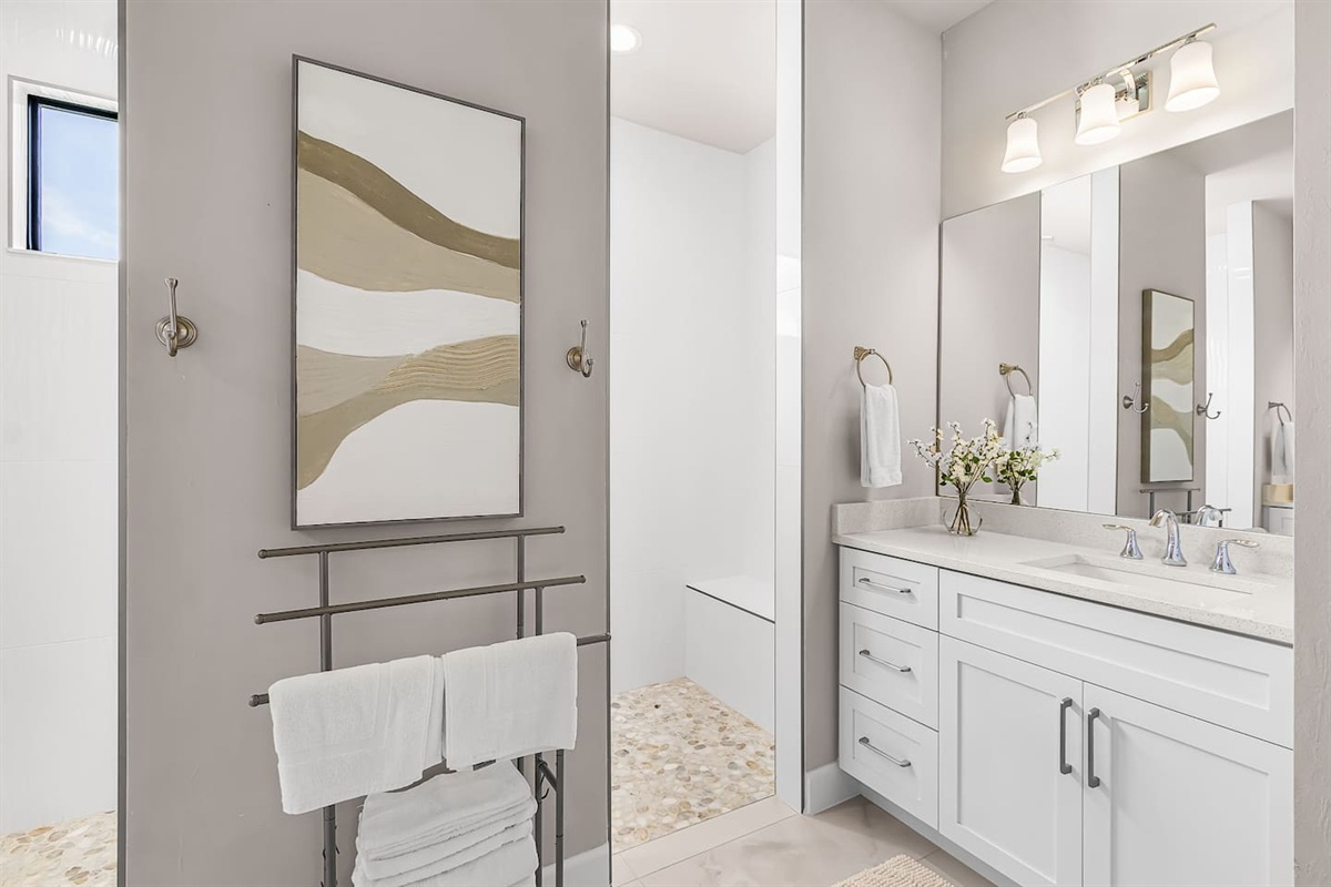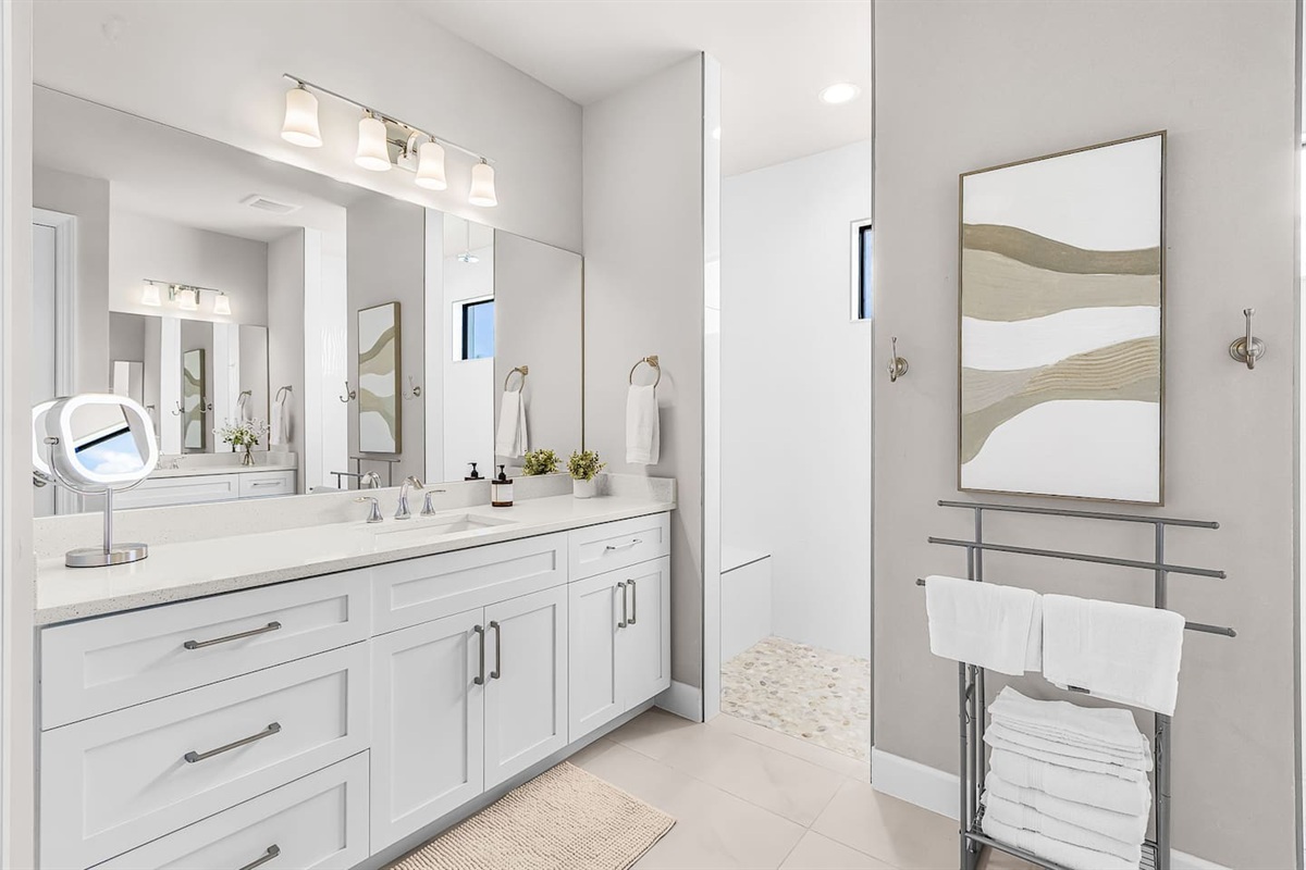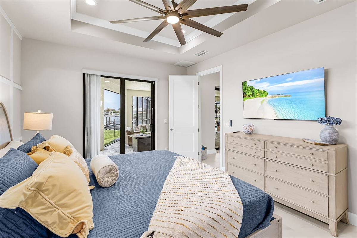 The primary suite is a private retreat, featuring a king-size bed, large TV, and direct access to the lanai and pool. The spa-inspired ensuite bathroom includes dual vanities, a soaking tub, and a spacious walk-in shower. The second bedroom offers a queen bed, TV, and its own ensuite bathroom with a walk-in shower, while the third bedroom also features a queen bed and TV, with easy access to a full bathroom with a tub/shower combination. Each space is thoughtfully designed for comfort, rest, and relaxation.