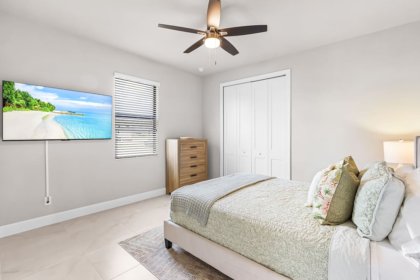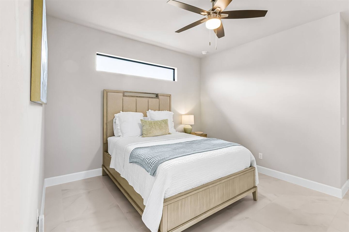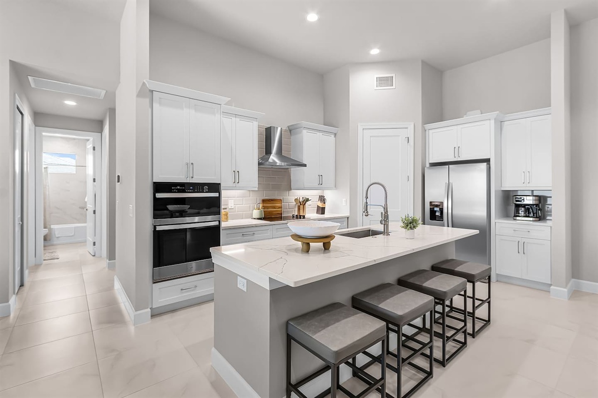 The primary suite is a private retreat, featuring a king-size bed, large TV, and direct access to the lanai and pool. The spa-inspired ensuite bathroom includes dual vanities, a soaking tub, and a spacious walk-in shower. The second bedroom offers a queen bed, TV, and its own ensuite bathroom with a walk-in shower, while the third bedroom also features a queen bed and TV, with easy access to a full bathroom with a tub/shower combination. Each space is thoughtfully designed for comfort, rest, and relaxation.