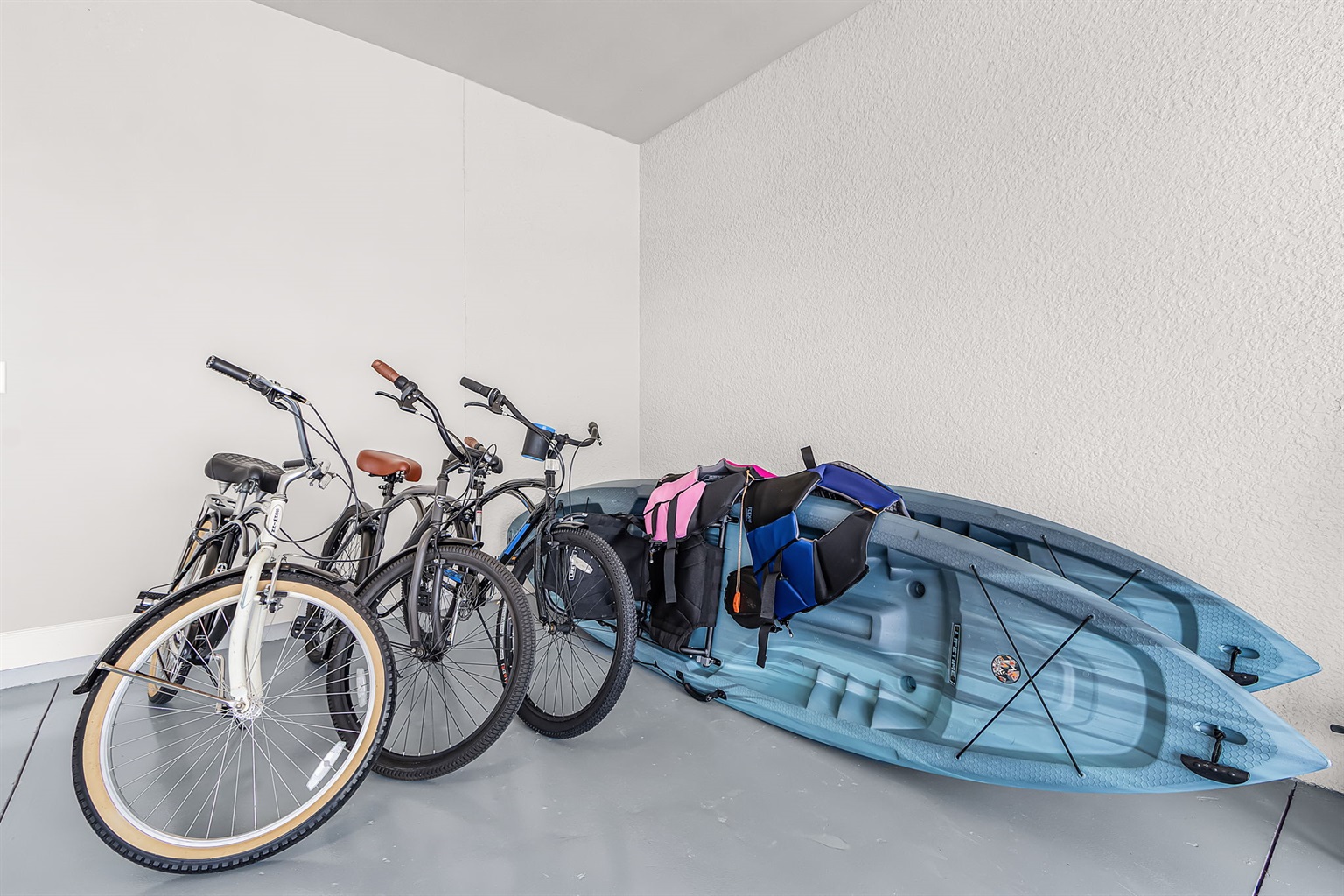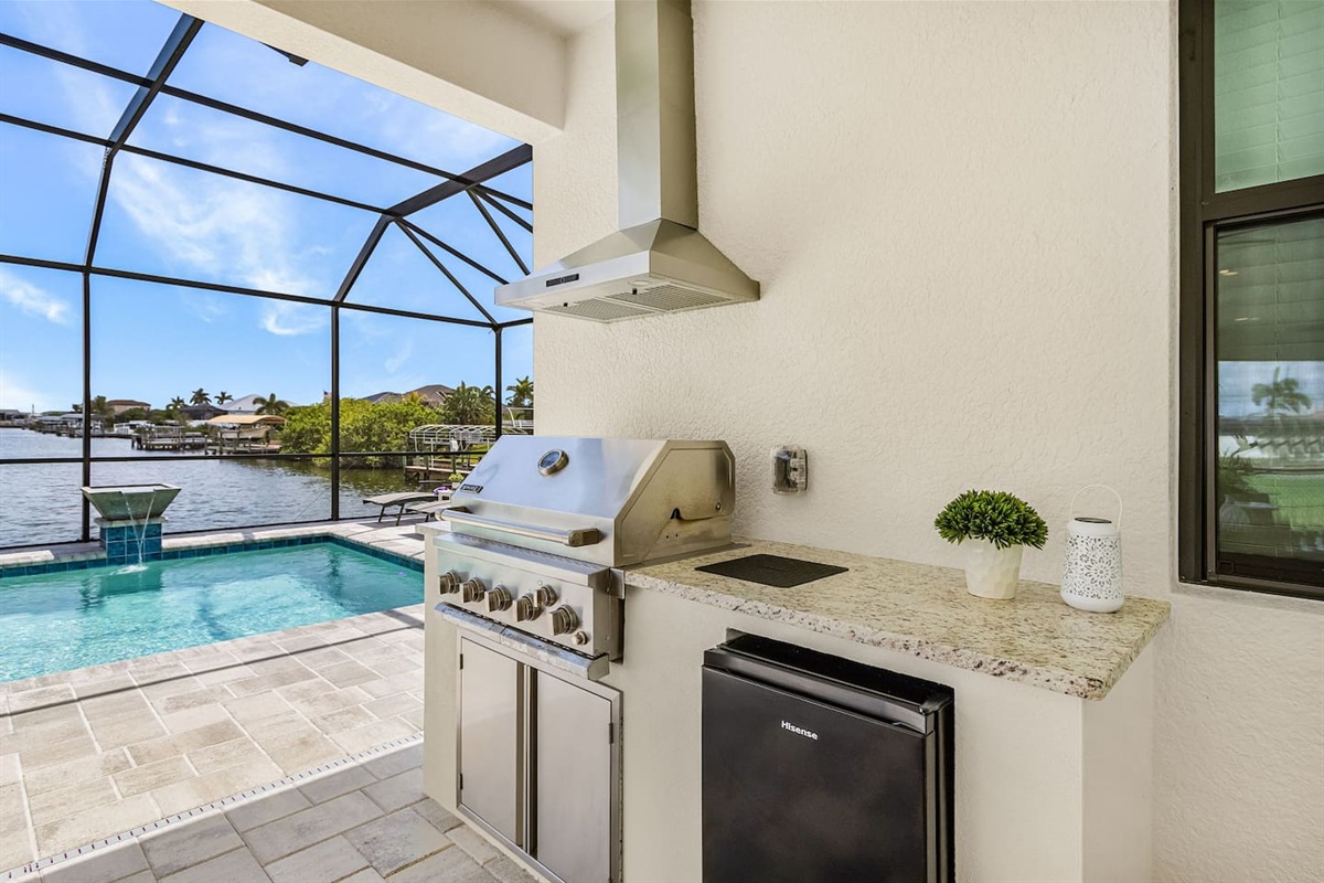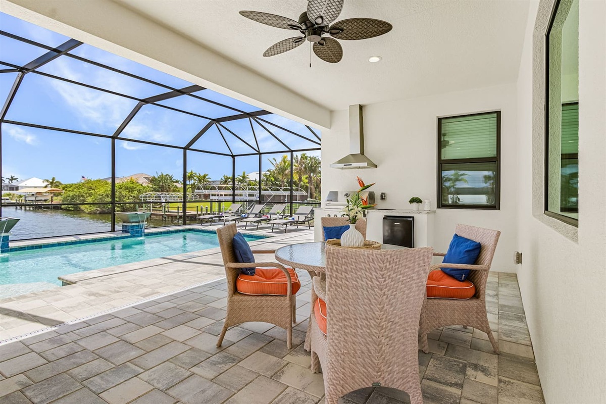 Outdoors is where this home truly comes to life, offering a private resort-style escape designed for effortless Florida living. The spacious lanai features comfortable seating, four lounge chairs, an outdoor dining area, BBQ grill, and a mini fridge - perfect for slow mornings, sunny afternoons, and relaxed evenings by the water. The heated pool with elegant water features overlooks the tranquil canal, creating a peaceful and private setting. When you’re ready for a bit of adventure, step directly into the water to kayak from the backyard, enjoy fishing along the canal, or explore the neighborhood on the provided bicycles.