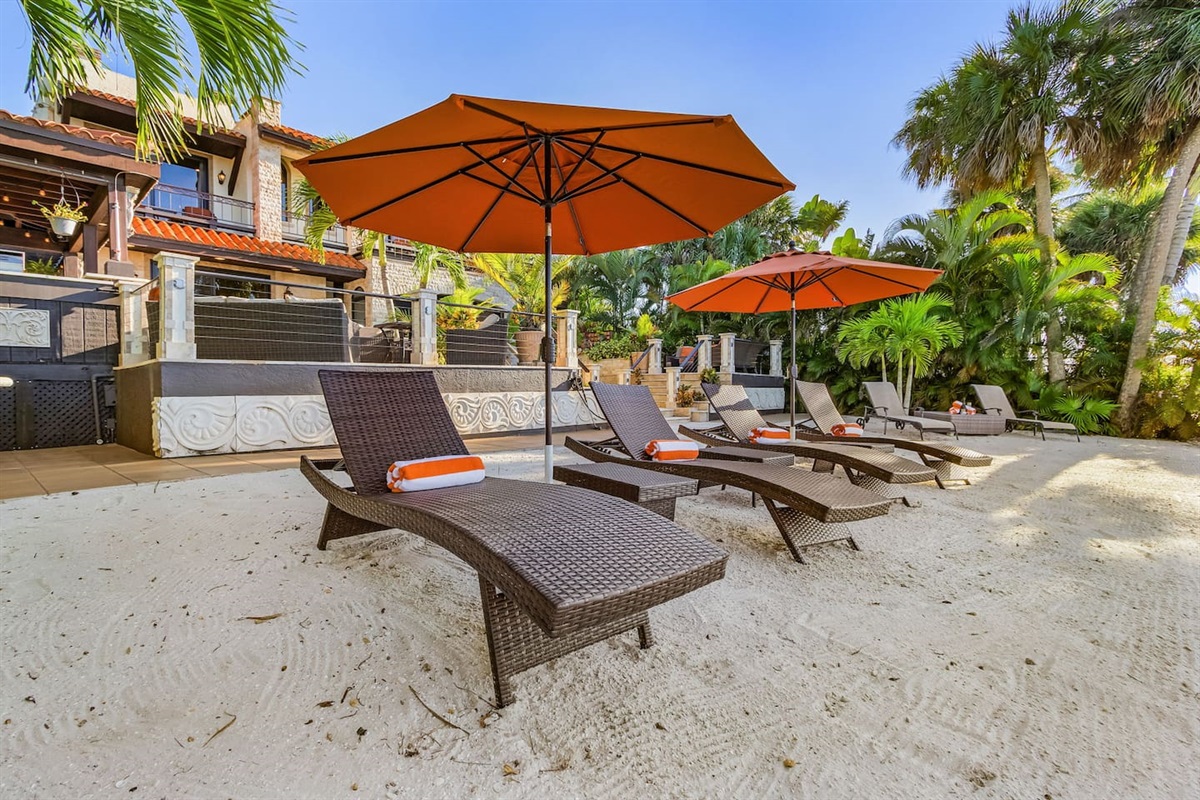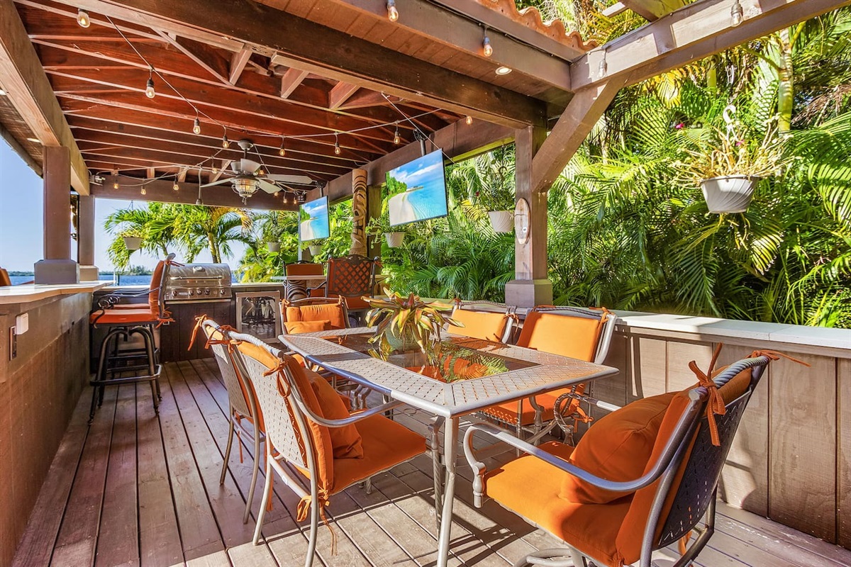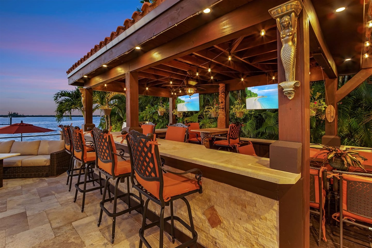 From the moment you arrive, Nascosto Estate enchants with Spanish-style elegance and breathtaking Caloosahatchee River views. The open-concept living area features plush seating, a warm imported stone fireplace, a large TV, and seamless access to the pool and lanai, creating a space designed for relaxing, laughing, and making memories with family and friends. The chef’s kitchen, outfitted with a gas stove, high-end appliances, and a grand island, flows effortlessly into the dining area that seats eight, a perfect setting for gourmet cooking, lively gatherings, or intimate celebrations, where every meal feels extraordinary. Every detail of the home exudes style, comfort, and a sense of pure indulgence, crafting a retreat that is as unforgettable as it is extraordinary, with every element carefully designed with guests in mind.