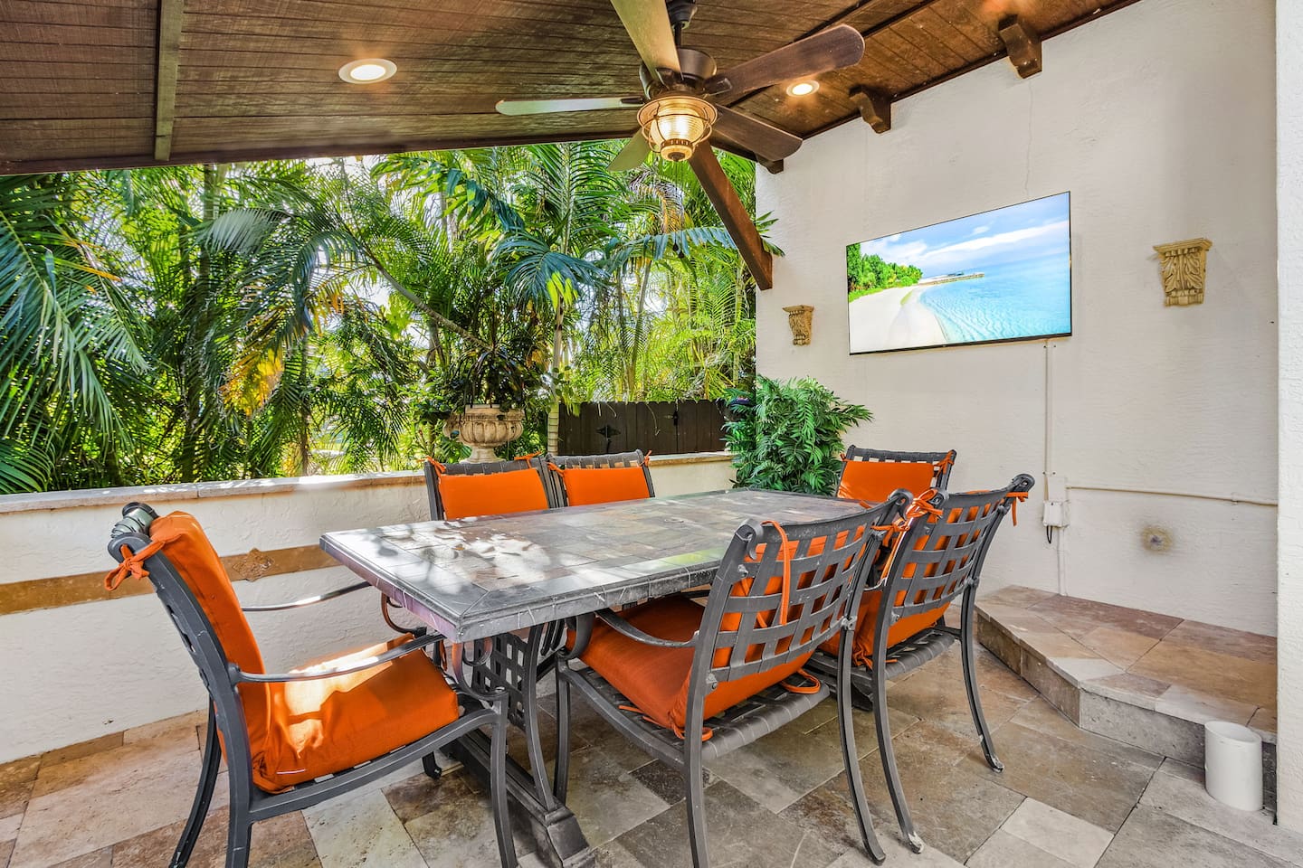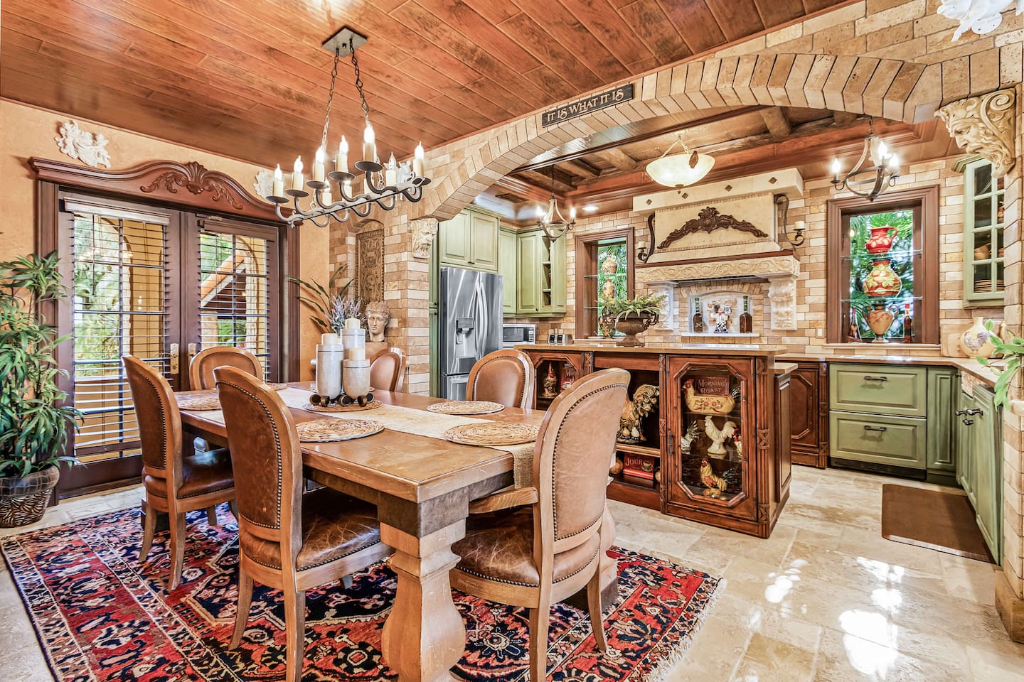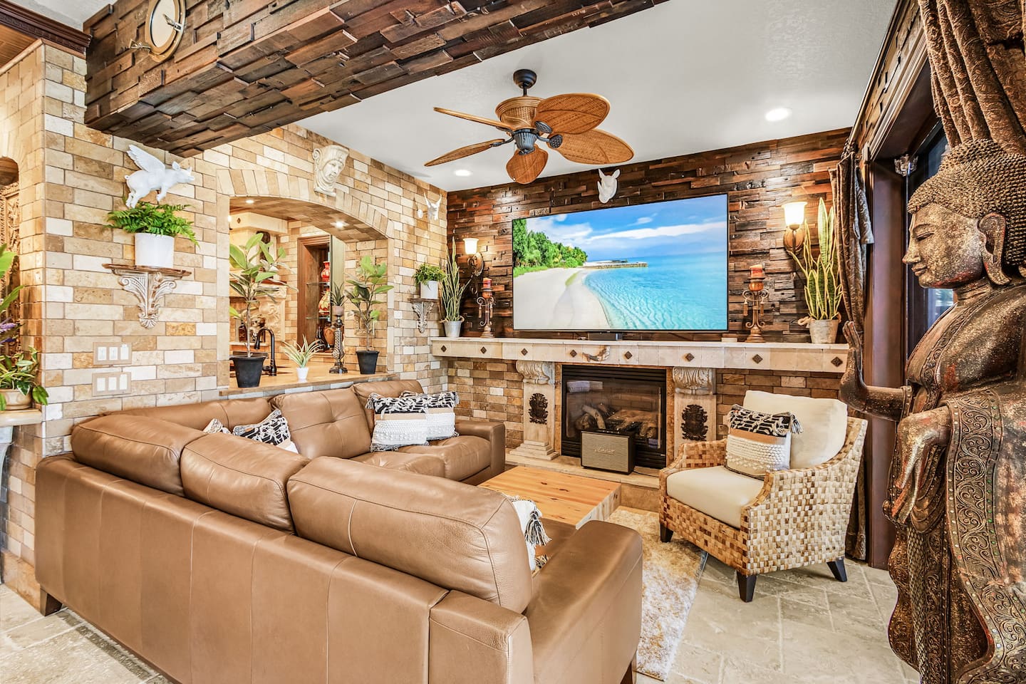 From the moment you arrive, Nascosto Estate enchants with Spanish-style elegance and breathtaking Caloosahatchee River views. The open-concept living area features plush seating, a warm imported stone fireplace, a large TV, and seamless access to the pool and lanai, creating a space designed for relaxing, laughing, and making memories with family and friends. The chef’s kitchen, outfitted with a gas stove, high-end appliances, and a grand island, flows effortlessly into the dining area that seats eight, a perfect setting for gourmet cooking, lively gatherings, or intimate celebrations, where every meal feels extraordinary. Every detail of the home exudes style, comfort, and a sense of pure indulgence, crafting a retreat that is as unforgettable as it is extraordinary, with every element carefully designed with guests in mind.