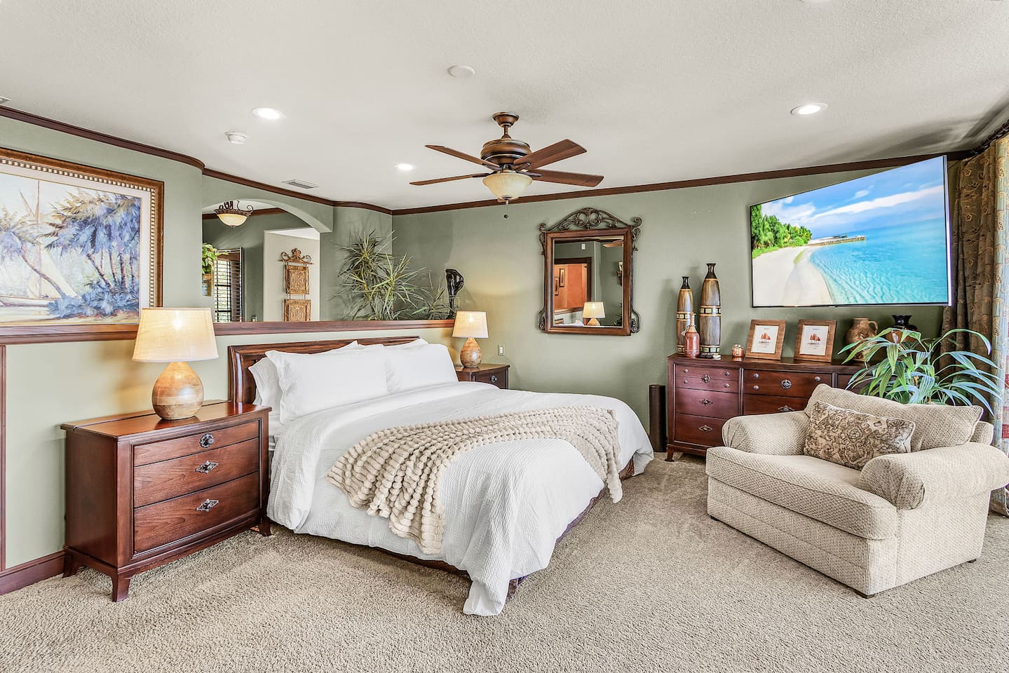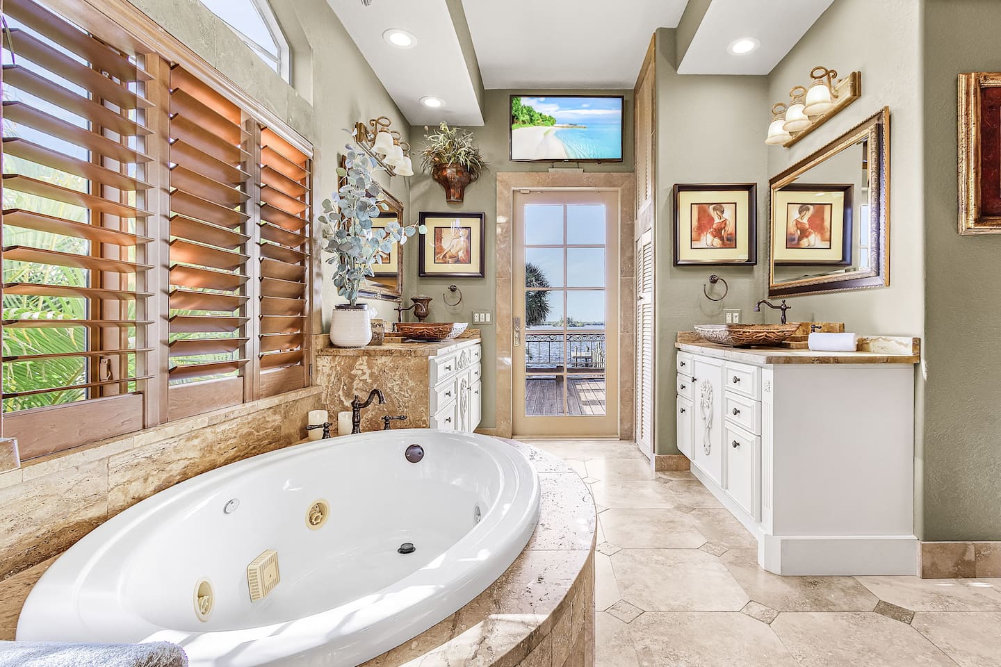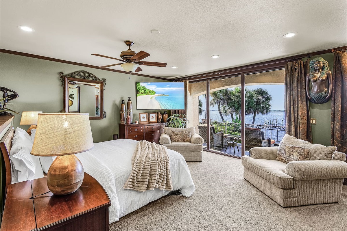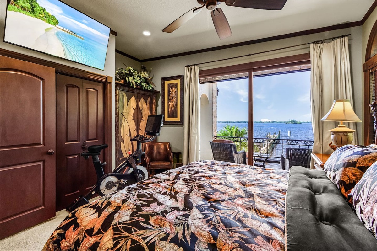 The primary suite is a true sanctuary, offering panoramic waterfront views that greet you the moment you wake, and a private balcony to take in the serene coastal scenery. The spa-inspired ensuite boasts a soaking tub, walk-in shower, three vanities, walk-in closet, and discreet TV, creating a retreat within a retreat. Two additional ensuite bedrooms feature king-size beds and TVs, with one upstairs bedroom enjoying its own balcony and sweeping water views, and one downstairs opening directly to the pool area, allowing effortless indoor-outdoor living.