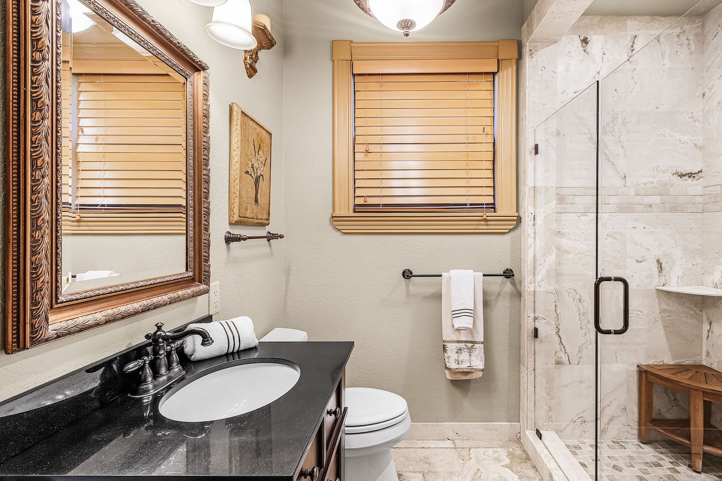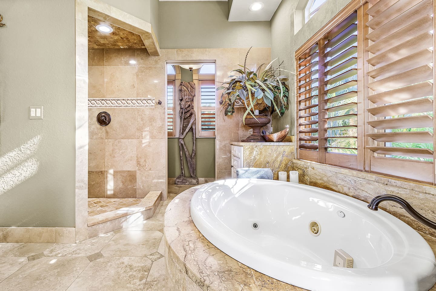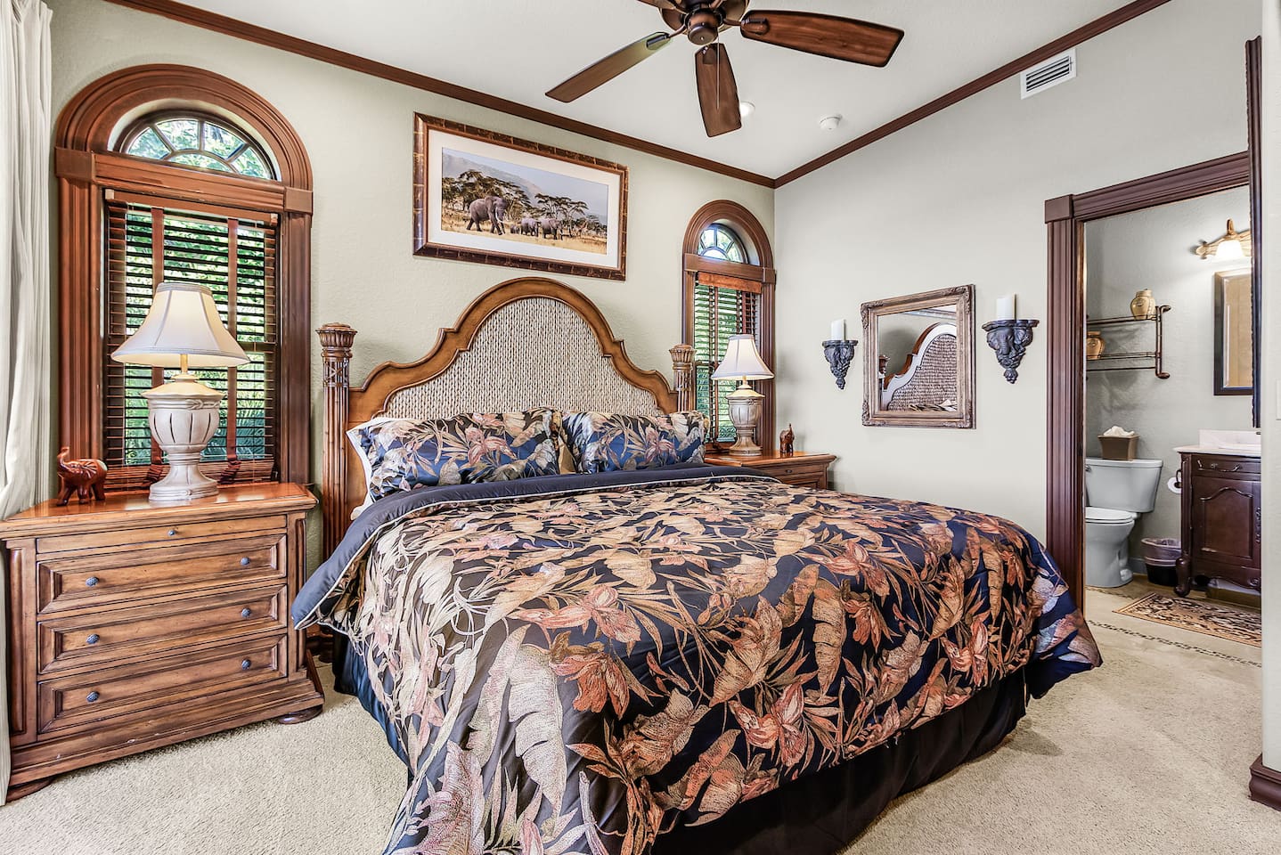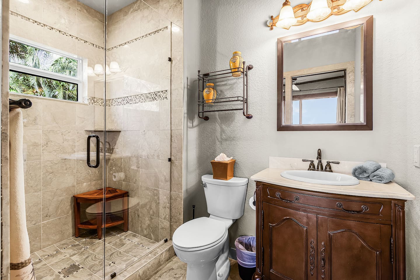 The primary suite is a true sanctuary, offering panoramic waterfront views that greet you the moment you wake, and a private balcony to take in the serene coastal scenery. The spa-inspired ensuite boasts a soaking tub, walk-in shower, three vanities, walk-in closet, and discreet TV, creating a retreat within a retreat. Two additional ensuite bedrooms feature king-size beds and TVs, with one upstairs bedroom enjoying its own balcony and sweeping water views, and one downstairs opening directly to the pool area, allowing effortless indoor-outdoor living.