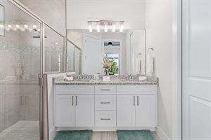 Your nightly rest is a haven of comfort in each of the five thoughtfully decorated bedrooms, featuring two primary suites that offer exclusive retreats. Luxurious bathrooms and spacious walk-in closets complement the coastal-inspired design, providing a soothing escape after a day of sun-soaked adventures.
