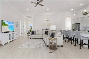 You will be greeted by high ceilings and expansive sliding glass doors seamlessly connecting the interior with the pool area and breathtaking water views. The spacious living area, adorned with comfortable seating and a large smart TV, reflects coastal and tropical elegance, creating an atmosphere of laid-back sophistication.