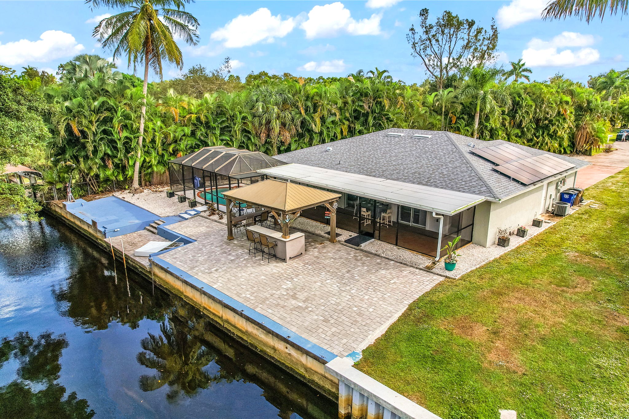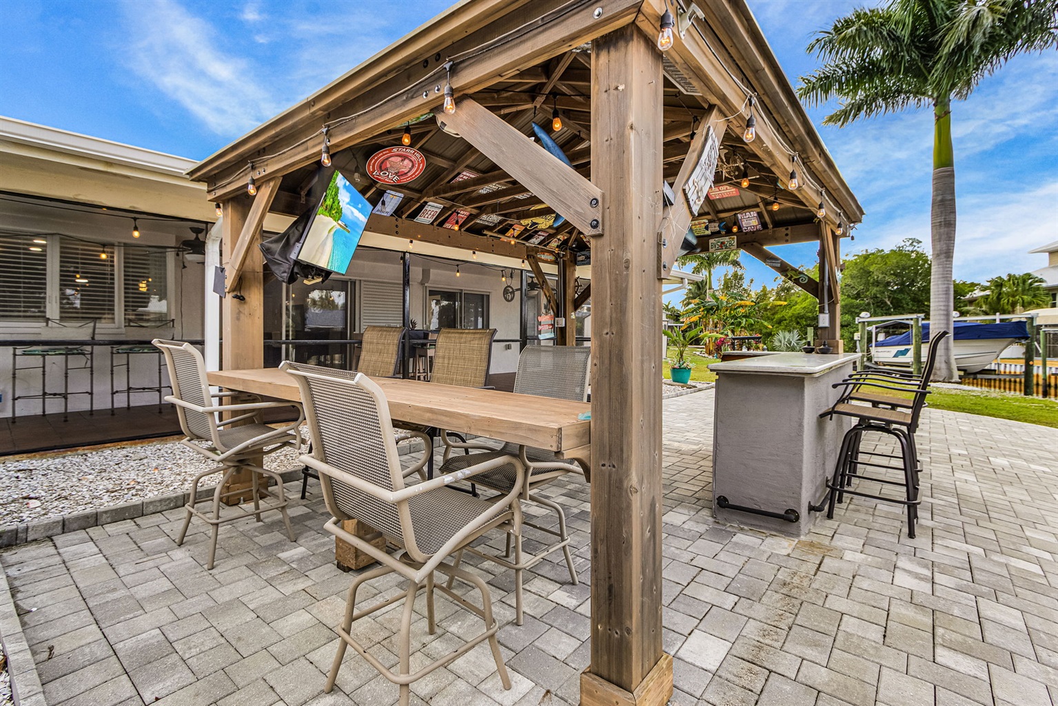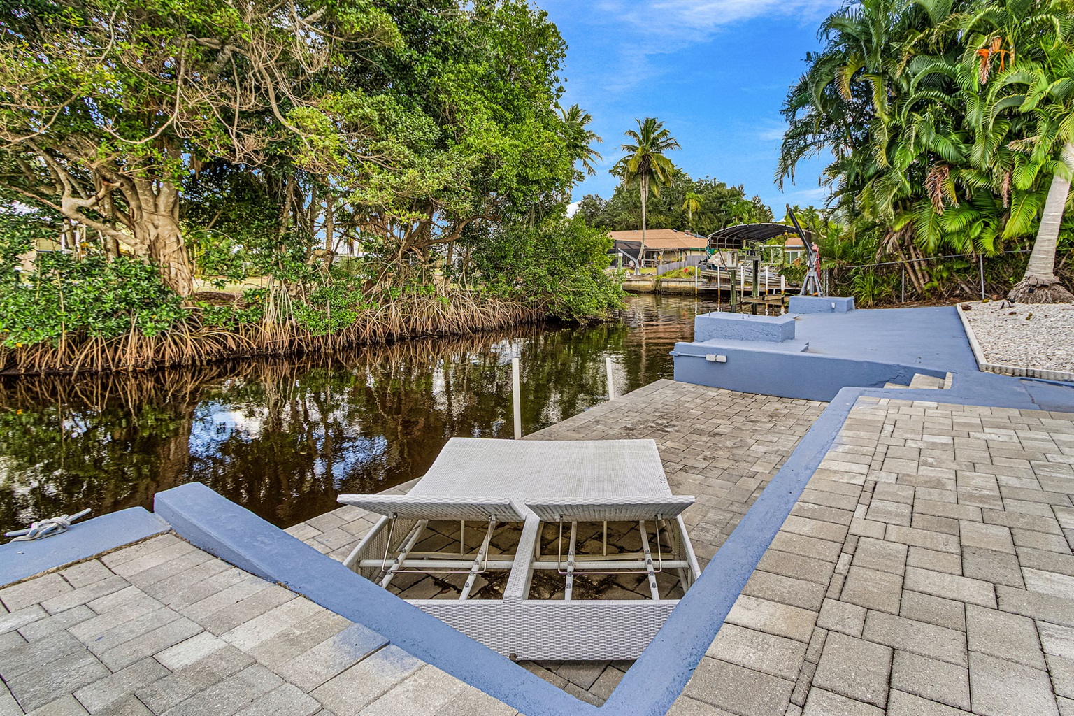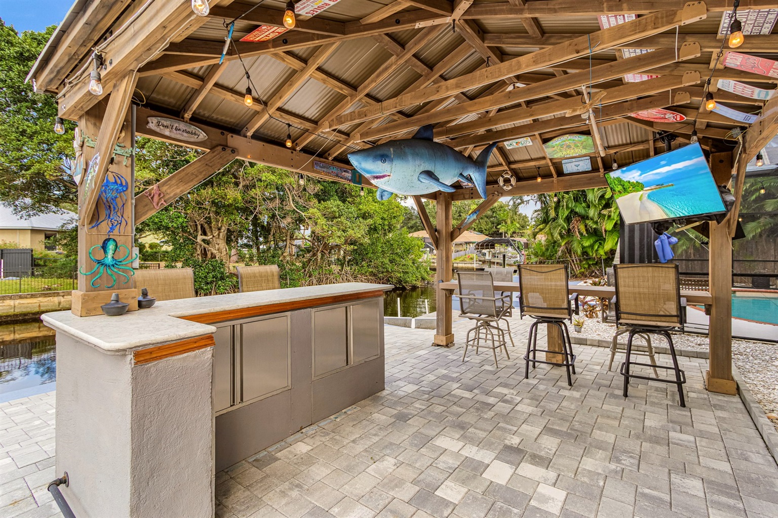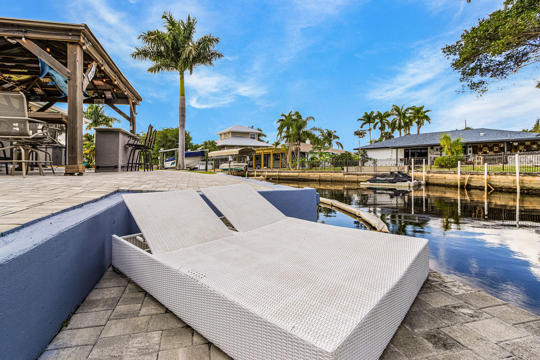 Step outside and discover your own private Florida oasis. The outdoor space is designed for laid-back luxury, complete with a heated pool, an outdoor bar with seating and TV, and plenty of room to lounge and entertain. Boaters will love the concrete dock, offering easy canal access straight out to the river. From sunrise swims to sunset drinks by the water, Villa Waters Edge invites you to slow down, unwind, and make unforgettable memories!