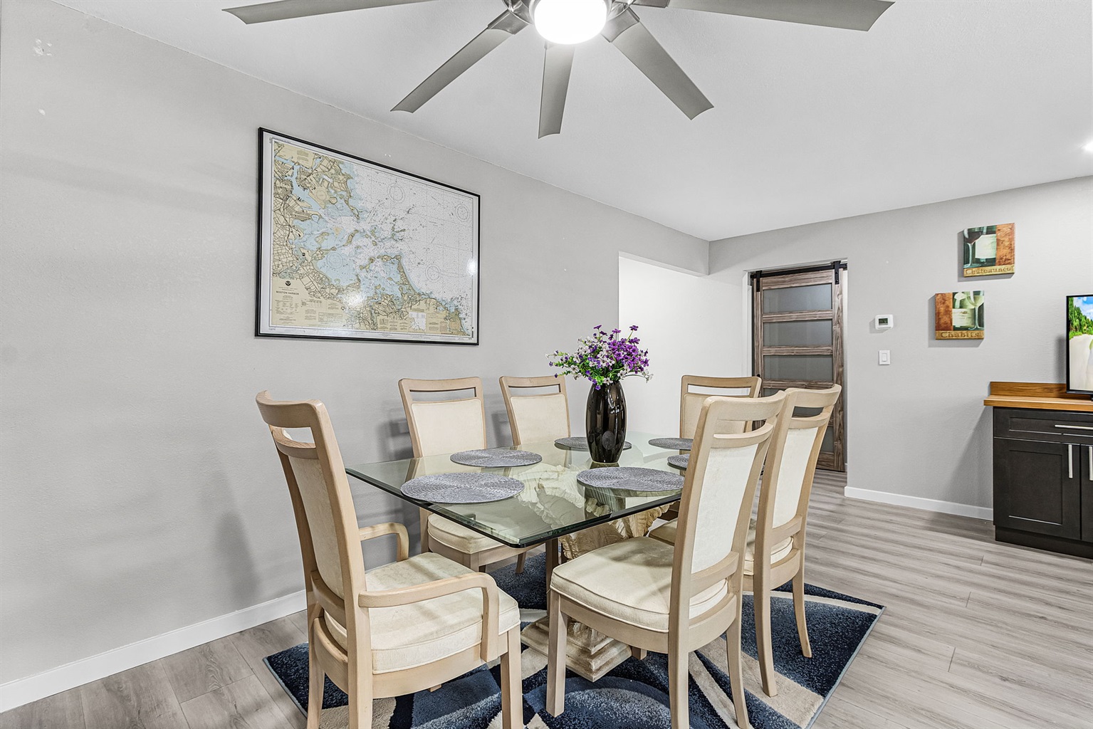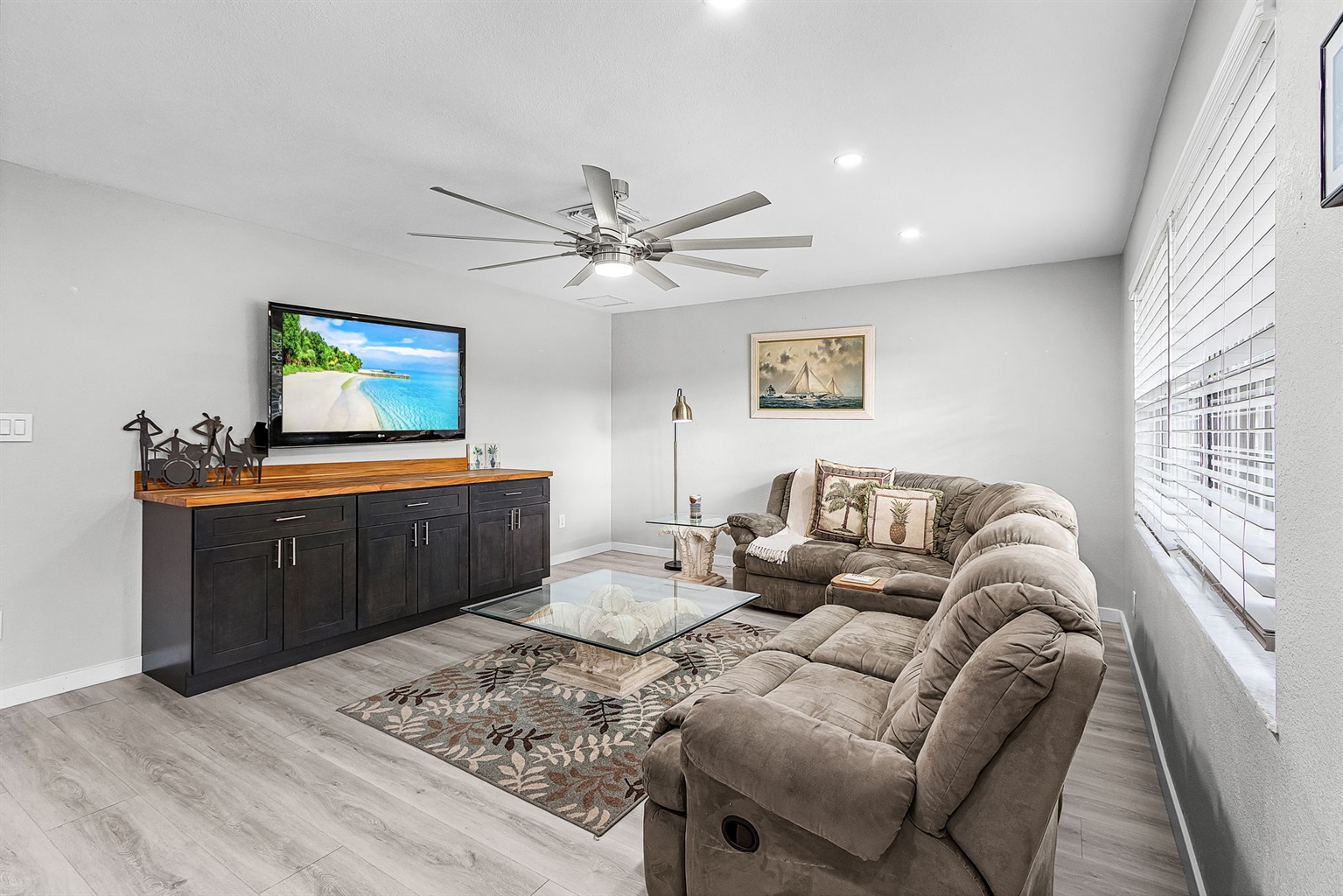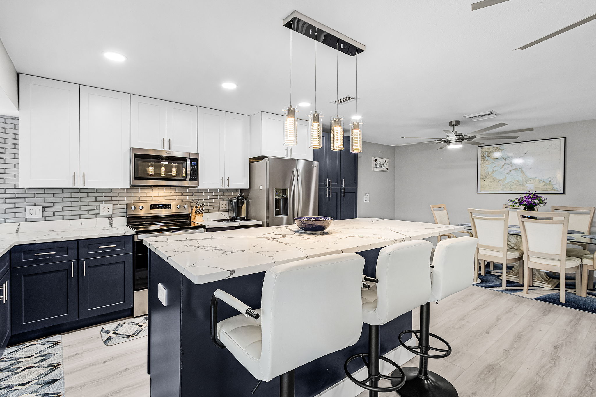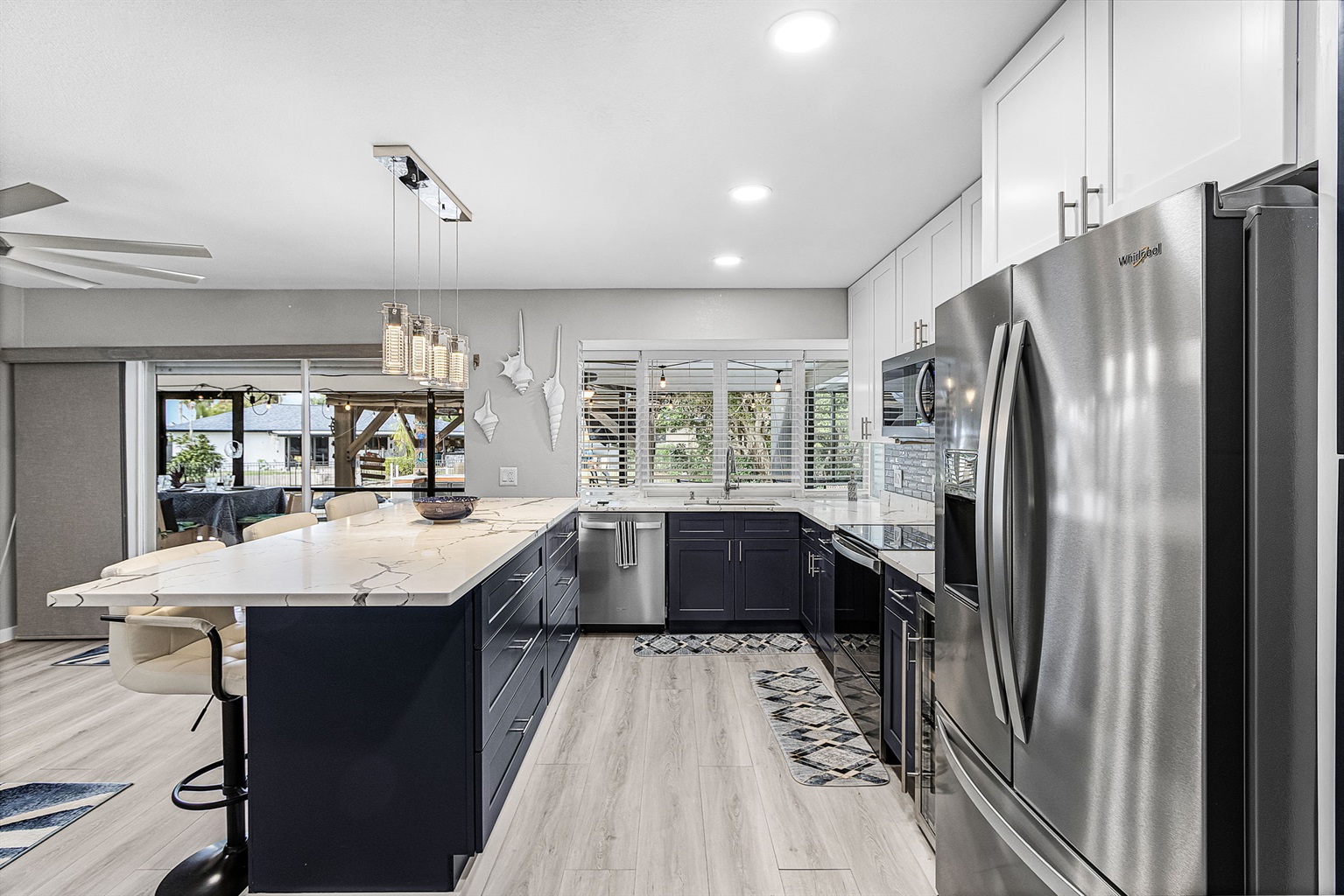 Inside, you’ll be greeted by a bright, open living space designed for comfort and connection. The newly remodeled kitchen is a standout, featuring gorgeous countertops, a spacious island, and modern appliances—ideal for preparing meals, gathering with family, or enjoying a casual bite before heading out on the water. The dining and living areas flow effortlessly, creating an inviting space to relax and recharge.